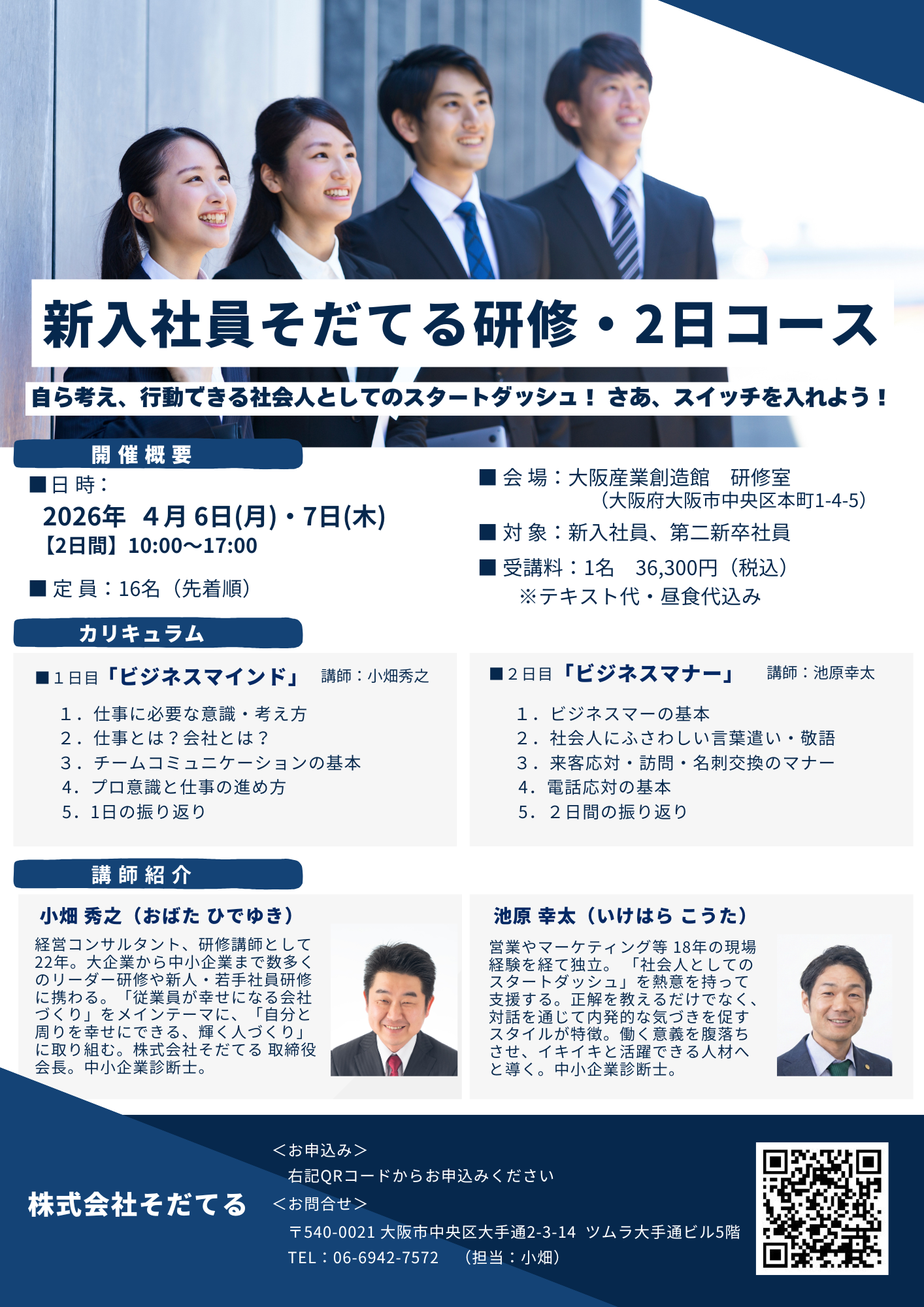 「2026新入社員そだてる研修」のご案内 公開日:2026年1月19日 研修・セミナー案内 申し込みはこちら↓ 2026新入社員そだてる研修・お申込みサイト チラシのダウンロードはこちら↓ 2026新入 […] 続きを読む